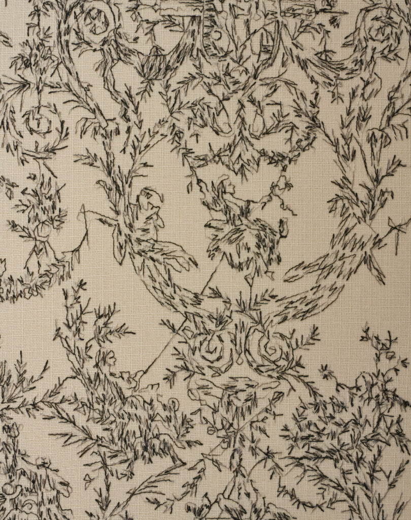 また、私が一筆書きでドローイングした図案をもとに、刺繍技術を駆使したルームインスタレーションを制作しました。絣糸のようにムラ染めを施した糸で刺繍を重ねることで、やわらかなフェード感をもつ特別な刺繍作品へと仕上げています。
