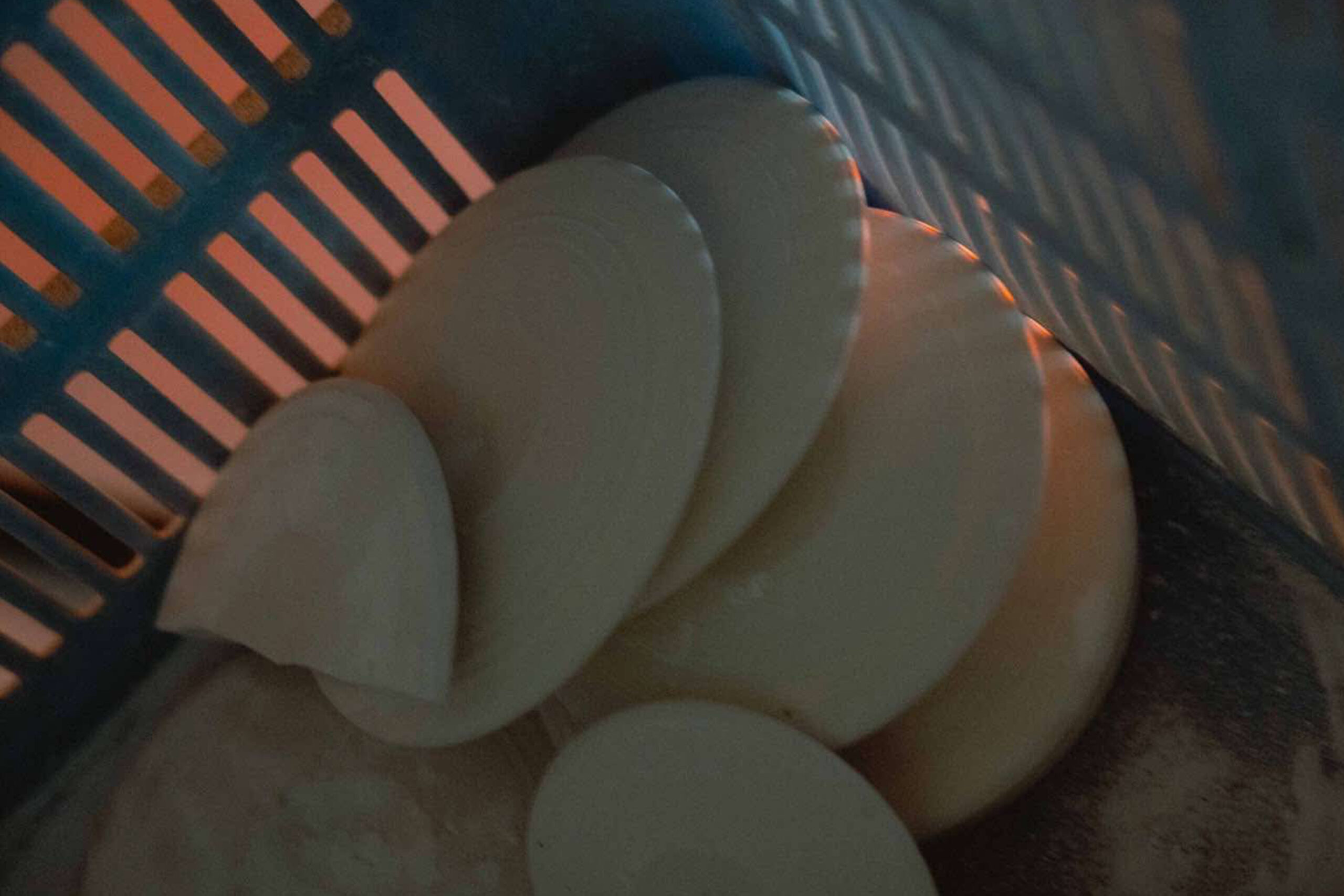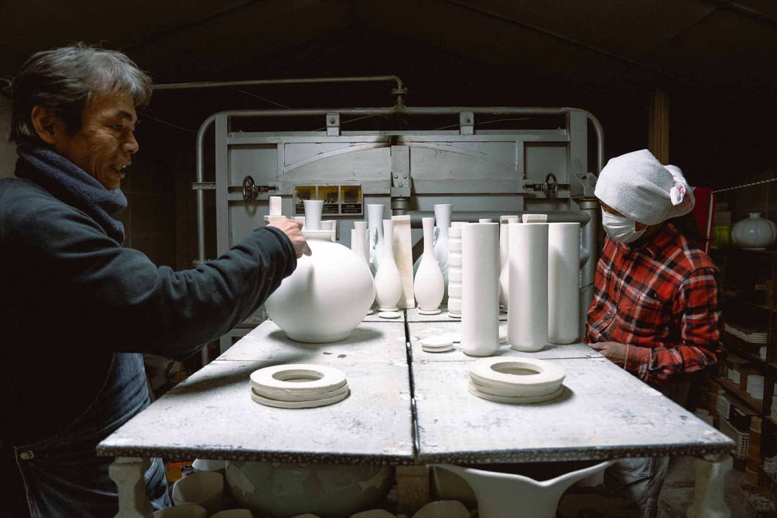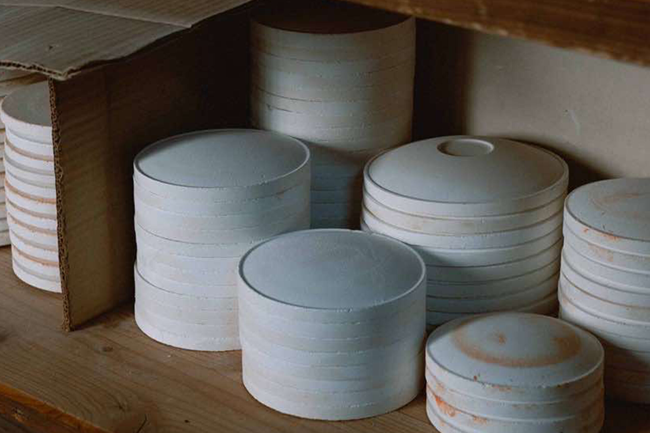ハマは丸く白い、一見なんの変哲もない焼物ですが、非常に美しいです。しかし、ハマの役割はあくまでも作品をつくるための道具にすぎず、その役割を終えたら捨てられます。焼物は土の状態だと再生できますが、焼成してしまうと化学変化を起こし、産業廃棄物に分類されます。毎年焼物の産地ではハマが大量に廃棄されていきます。プロダクトデザイナーの鈴木と、メンバーの白水とで井上の工房に訪れた時にそれを見て、これはなにか形にできるのではないかと発想をはじめたのが私たちのプロジェクトの初動です。