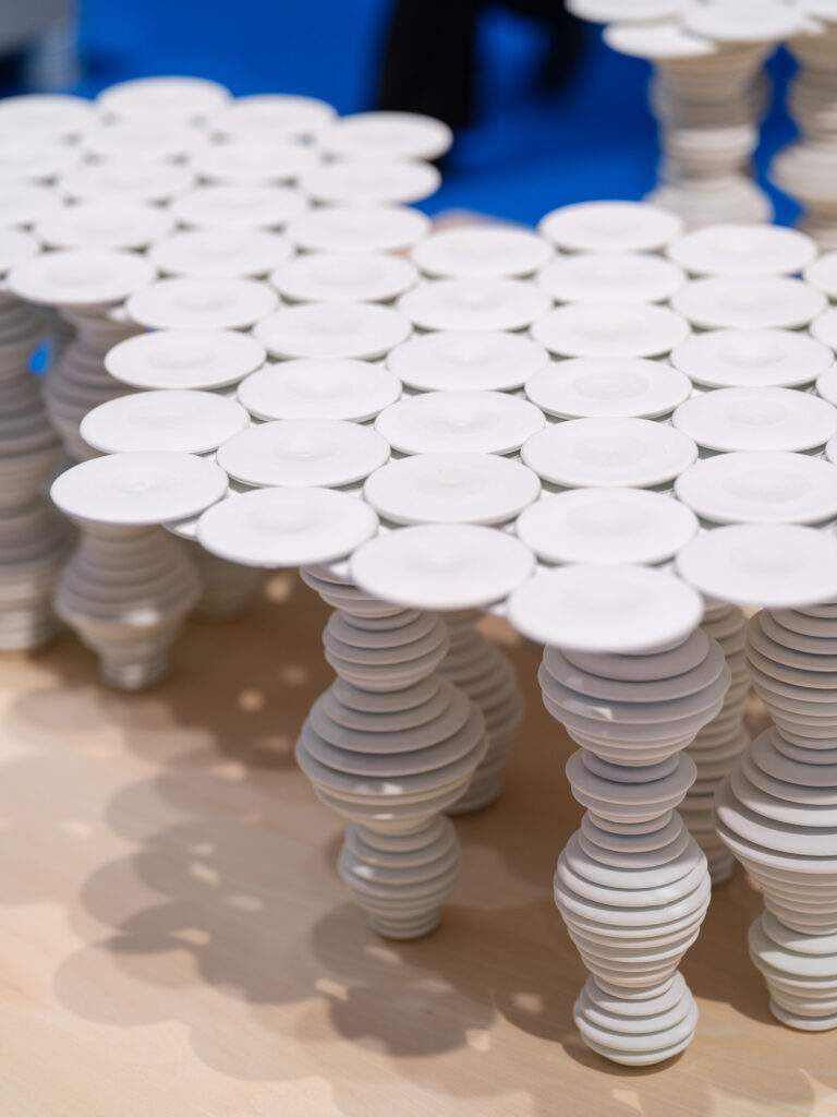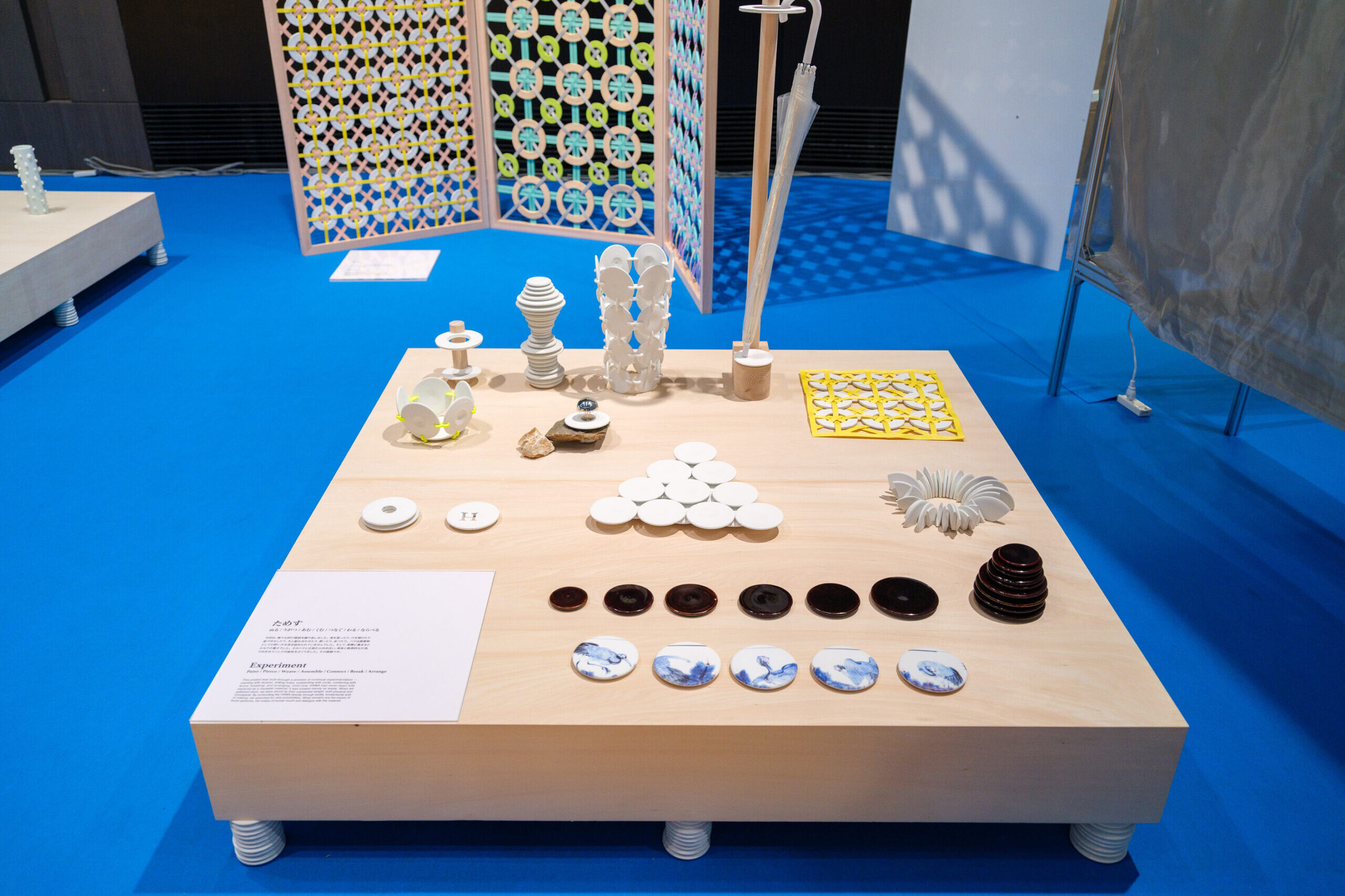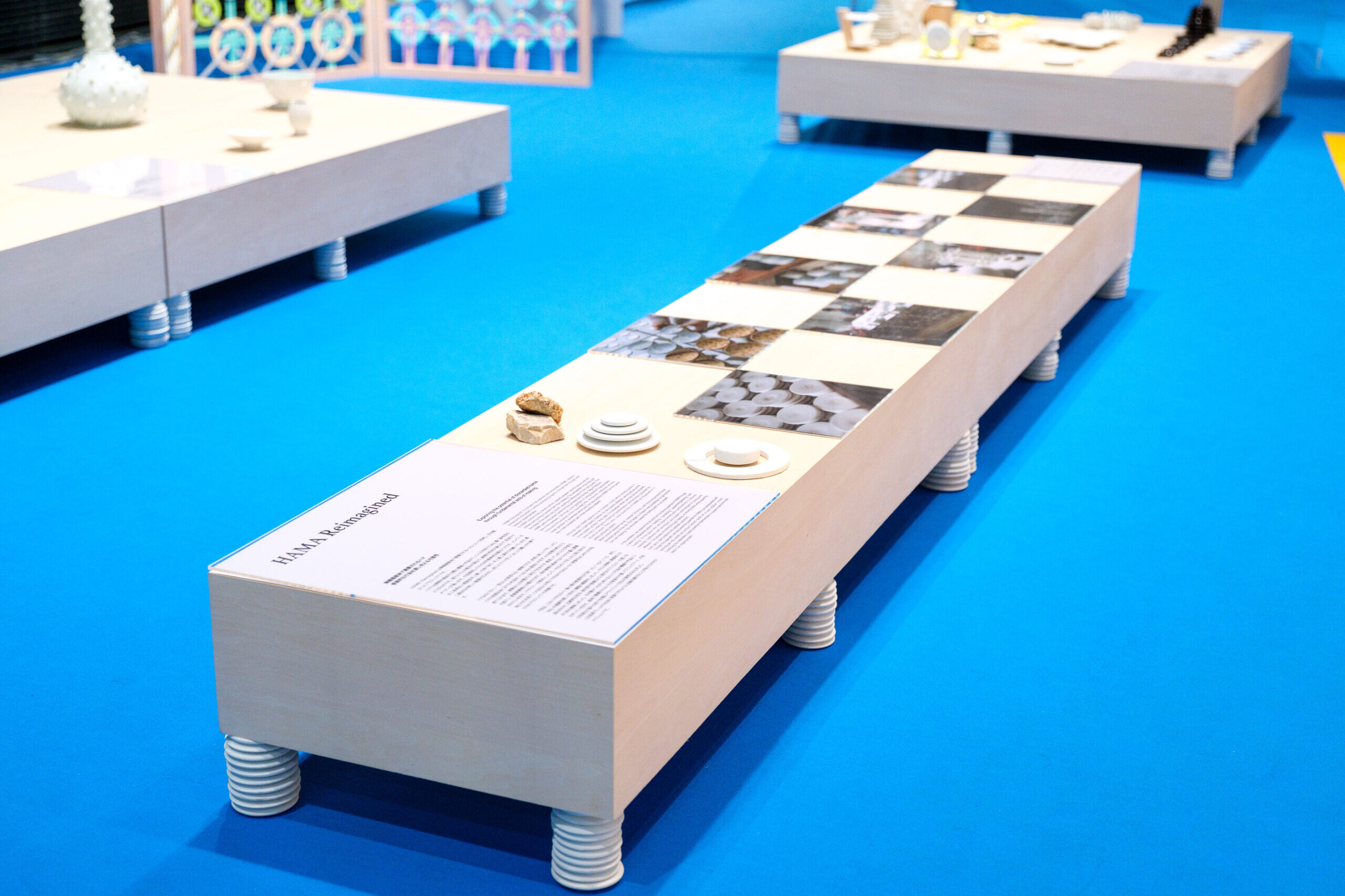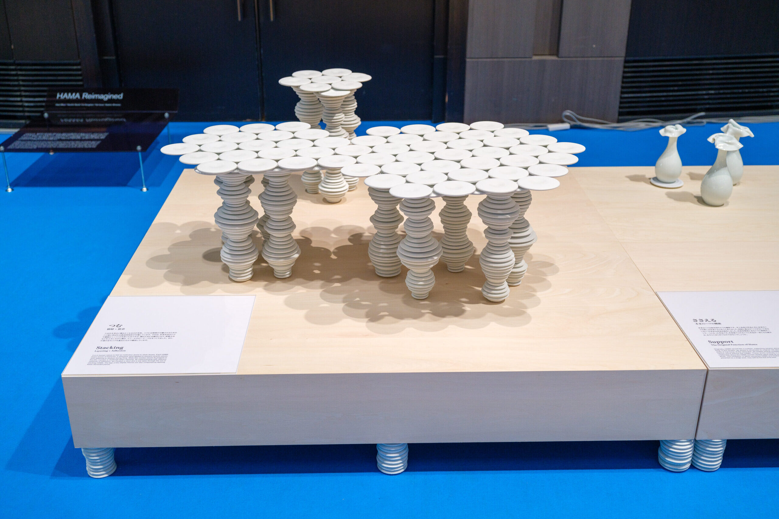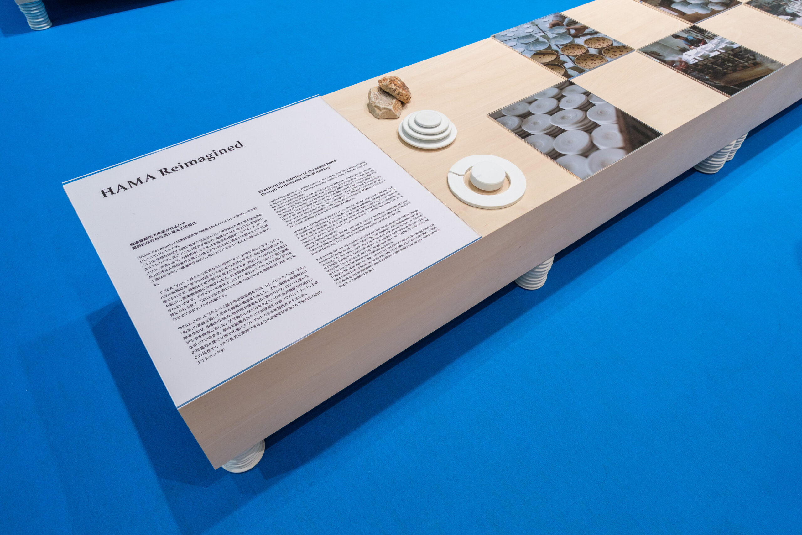 HAMAは陶磁器産地で廃棄されるハマについて思考し、手を動かしたプロジェクトです。ハマとは焼物を焼成する際に棚板と作品がくっつくのを防ぐために置く座布団のようなものです。窯ごとで土の配合が異なり、焼物の形状が違うので、形状やクオリティが違います。今回使用したものは佐賀県有田焼のハマです。メンバーの井上祐希は人間国宝井上萬二の孫であり、井上萬二窯を引き継いでいます。萬二窯は白の美しい磁器を生み出し、同じ土でハマをつくることも職人の仕事です。