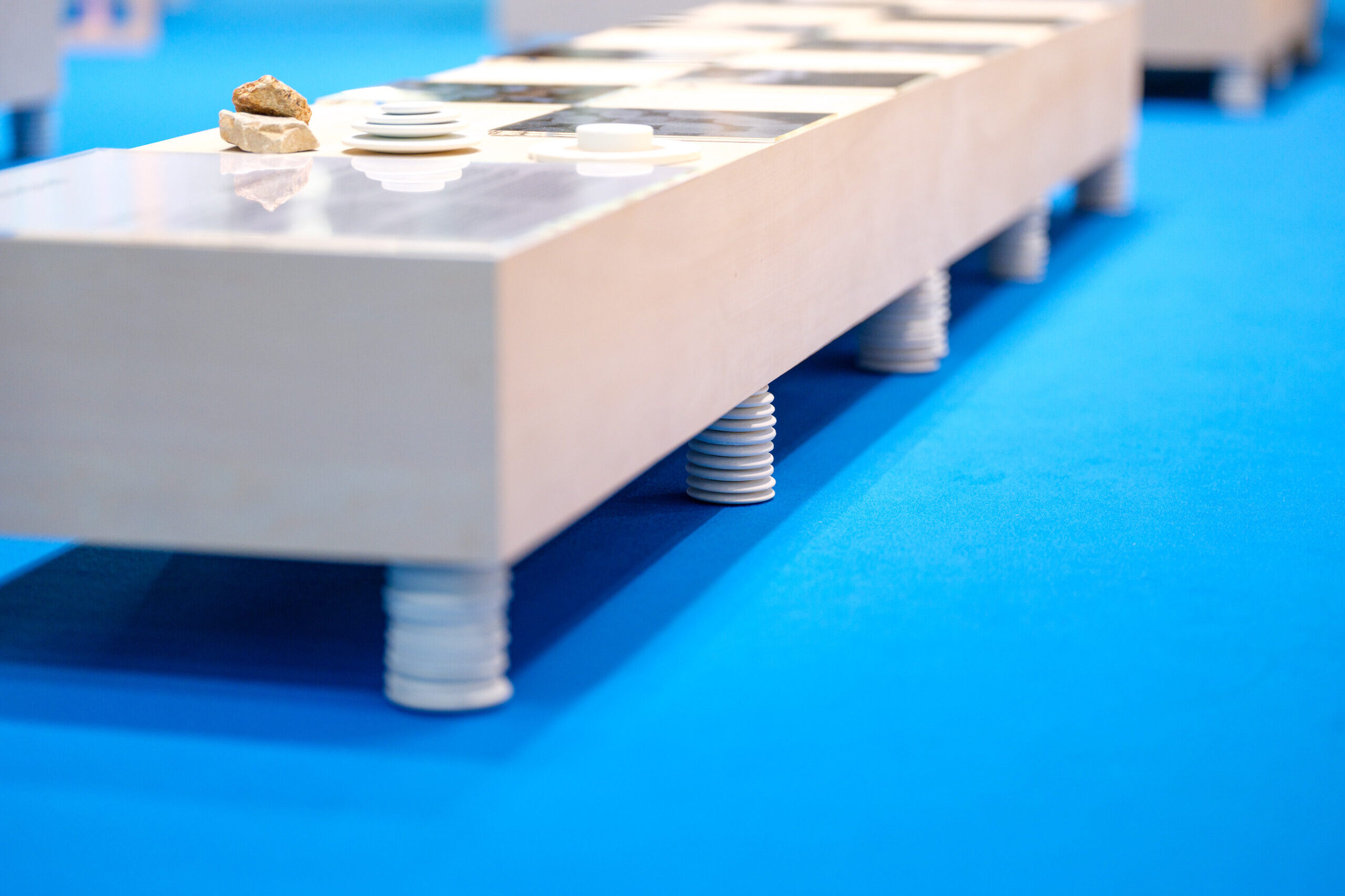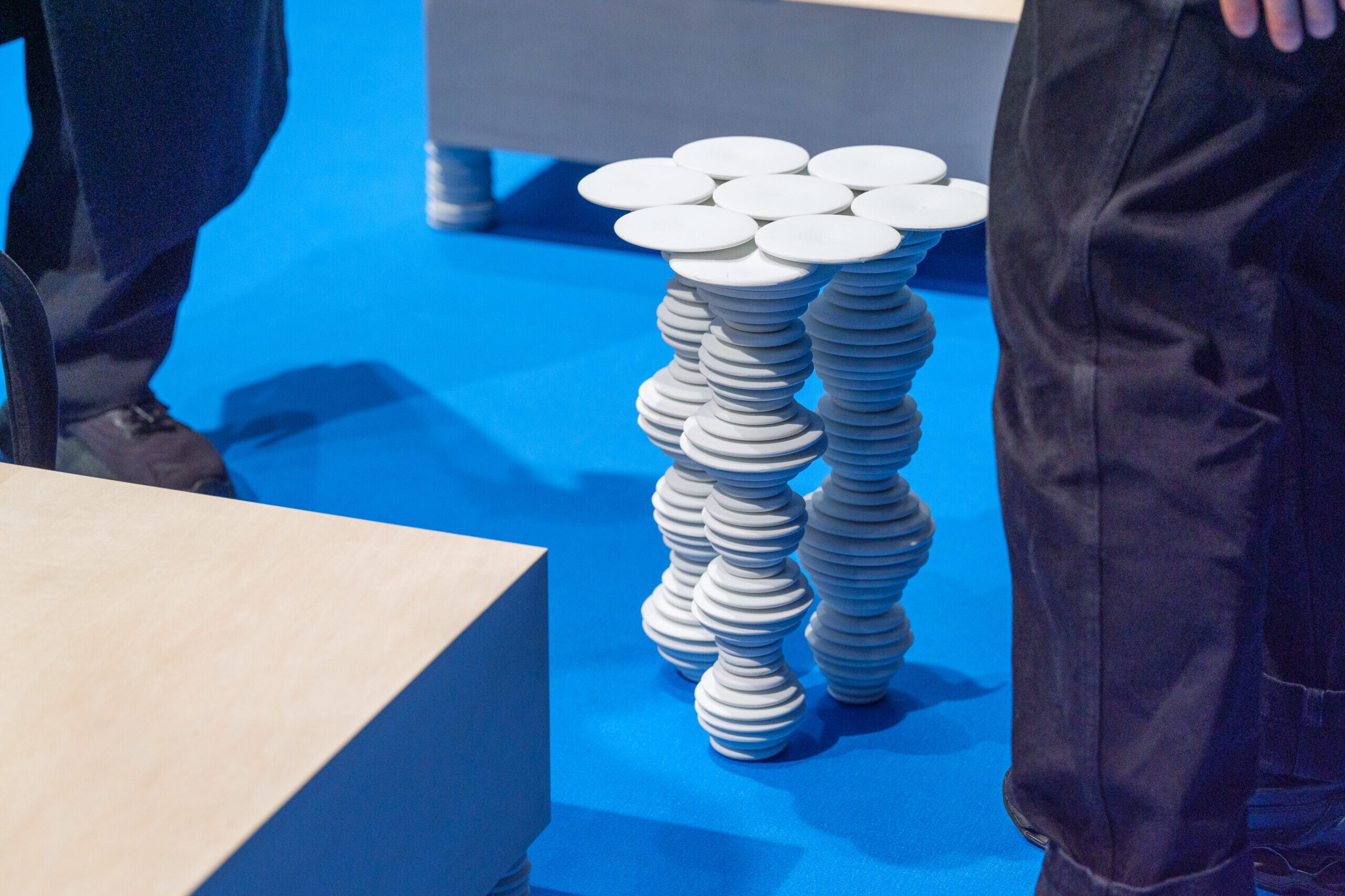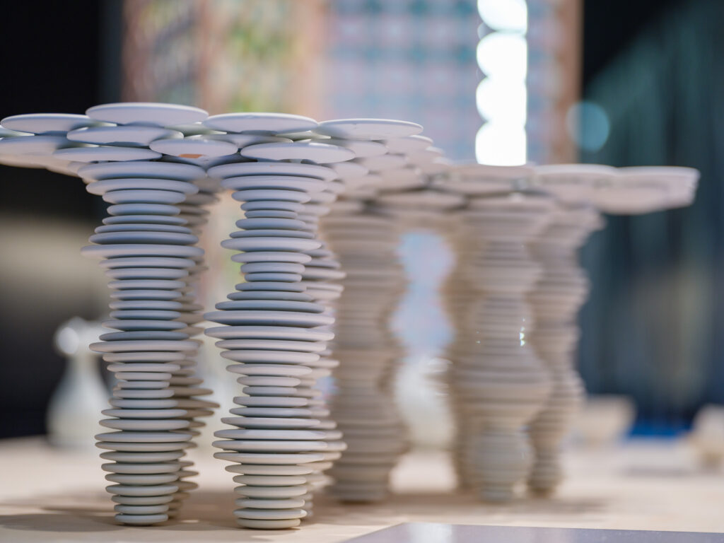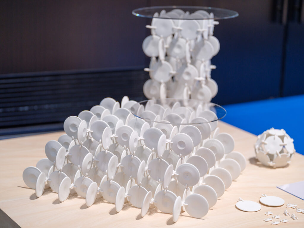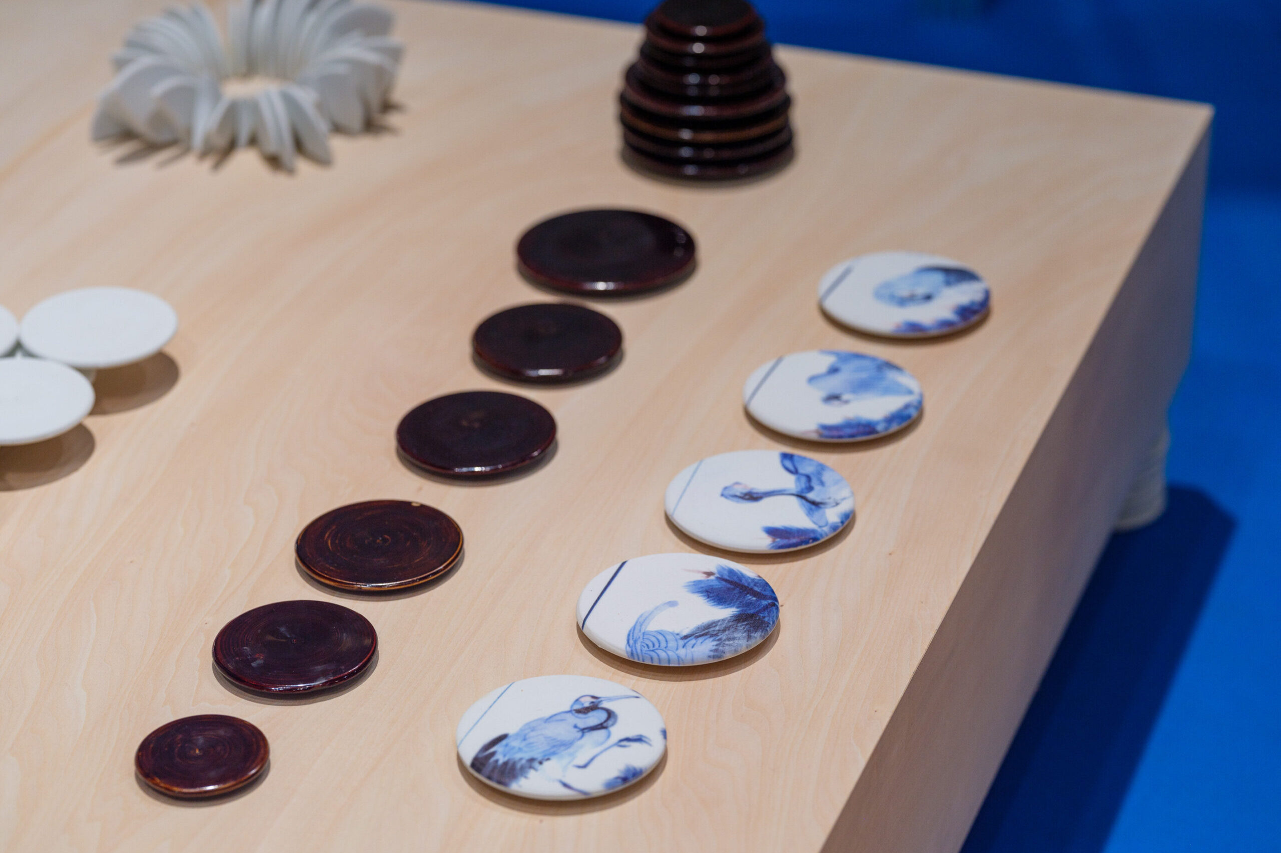 HAMAは陶磁器産地で廃棄されるハマについて思考し、手を動かしたプロジェクトです。ハマとは焼物を焼成する際に棚板と作品がくっつくのを防ぐために置く座布団のようなものです。窯ごとで土の配合が異なり、焼物の形状が違うので、形状やクオリティが違います。今回使用したものは佐賀県有田焼のハマです。メンバーの井上祐希は人間国宝井上萬二の孫であり、井上萬二窯を引き継いでいます。萬二窯は白の美しい磁器を生み出し、同じ土でハマをつくることも職人の仕事です。